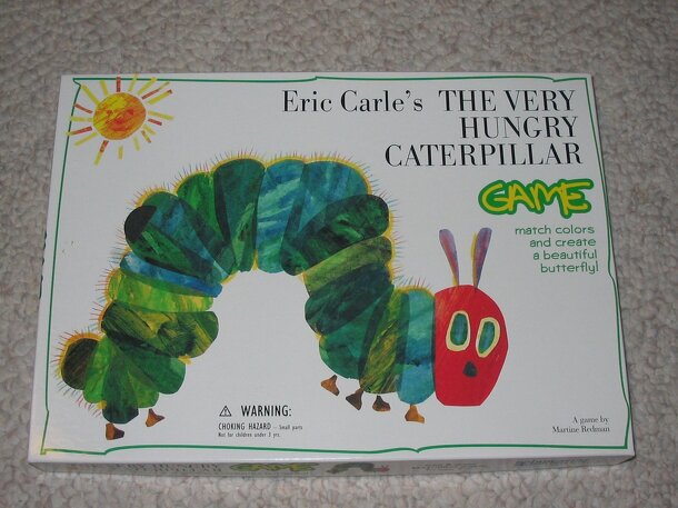 Based on the children's book of the same name by Eric Carle, Philomel Press. From the box back: Match colors and create a beautiful butterfly. Each player has five fruits of matching color and shape. Play proceeds with a spinner, first player to place all their shapes on the butterfly wins. Can also be played cooperatively. This game helps young players to...