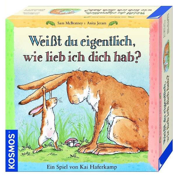 After the well-known children's book "Guess how much I love you" by Sam McBratney and Anita Jeram, Kosmos now also presents the matching game to the children's book. Just like in the book, it has to be estimated how much the little rabbit loves the big rabbit. Before the game starts, the hare figure is assembled and placed in front of the oldest player....