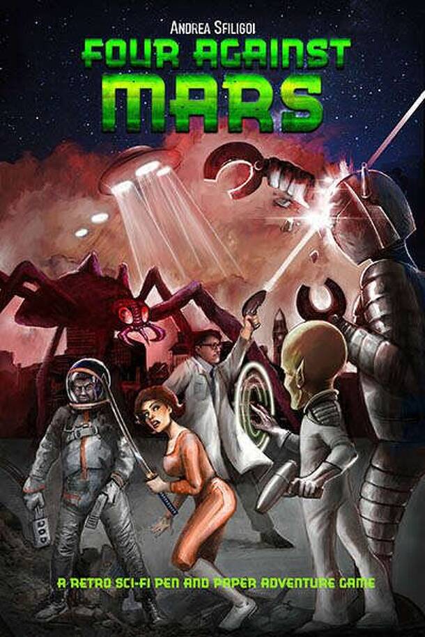 Four Against Mars is an atomic-age, science-fiction, pen-and-paper game. Using the Four Against Darkness popular system, you will play solo or coop missions against alien invaders in a small town. Battle Martians, Venusians, Reptilians, Zeta-Reticulans and their monsters. Available characters include scientists, survivalists, combat specialists, criminals...