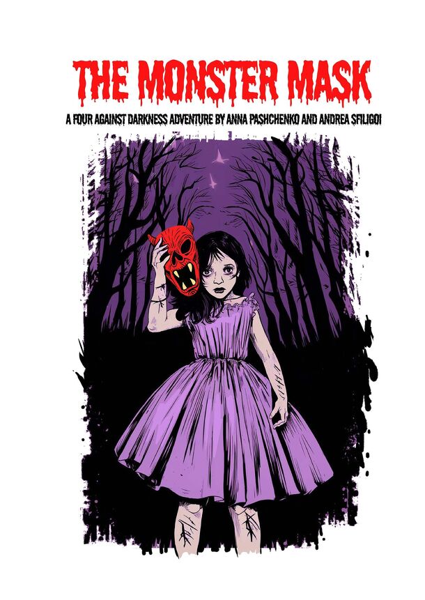 You are walking on a forest path. It is late afternoon, and you plan to set up camp soon, when a girl in a lilac gown, her long brown hair flowing and adorned with a ribbon, appears on your path. Her arms and legs bear deep scratches, and she is breathing heavily. In her hands, she holds a monstrous mask made of thick red paper. As she sees you, she halts...