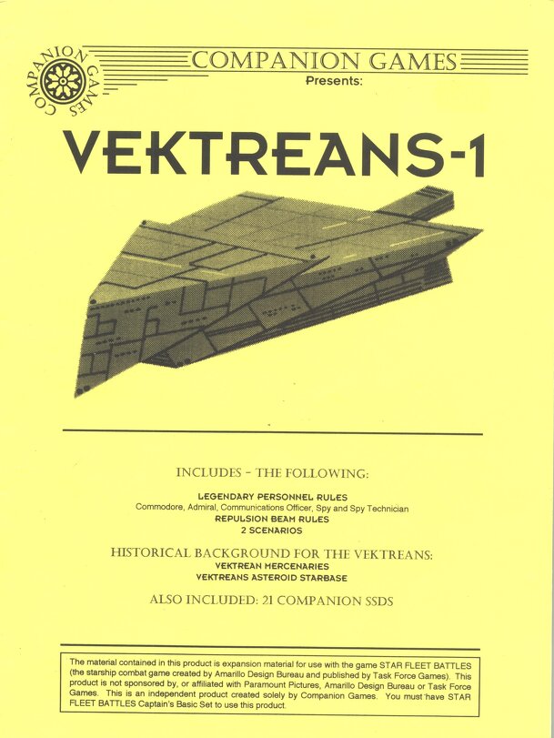 This is an expansion for the game Star Fleet Battles Captain's Edition that introduct the Vektreans race. The Vektreans are a mercenary race mainly located in the "Far SIde of the Galaxy" area, that is the area where the Comapnion Games located the races of her develoment. This race, as the Argonians, has a branch that moved to the standard Star Fleet...