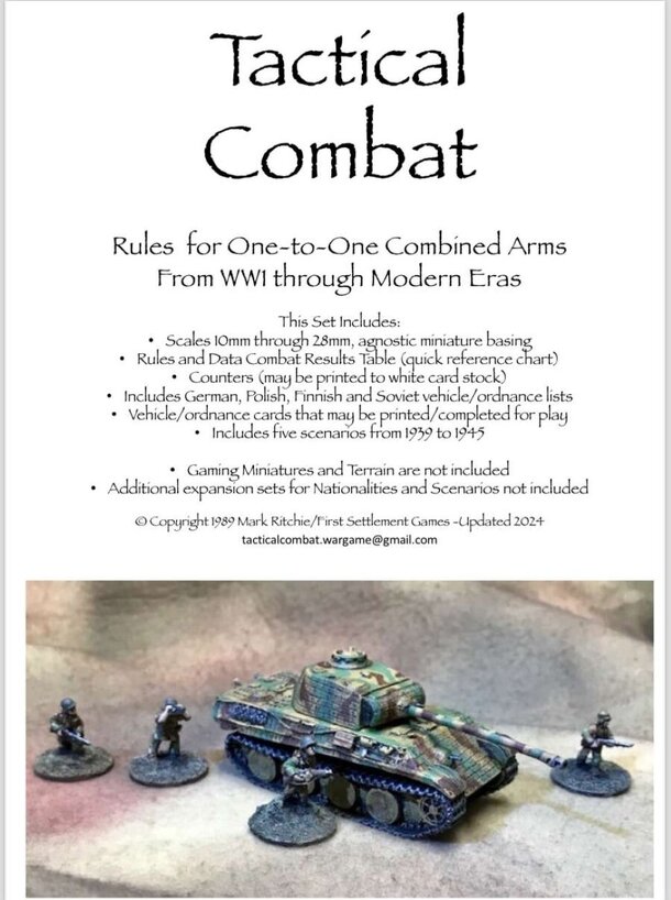 Tactical Combat (TC) was developed in 1989 providing a system to game 1:1 scale historical-based scenarios. TC provides realistic vehicle and weapon statistics and effects so gamers may also attempt to duplicate tactical doctrine in their wargames. TC is a departure from dice heavy hit/save mechanics that can seem abstract. This is the BASE GAME RULES used...