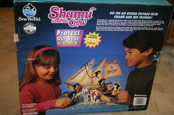 From the back of the box: "Go on an ocean voyage with Shamu and his friends! Get ready for a spectacular journey where you will help brng Shamu's friends to safety! In this exciting game, you'll have fun as you learn about some of the dangers that face our friends who live in the seas. Dolly Dolphin is caught in a net and Pete Penguin is atop an iceberg....