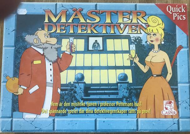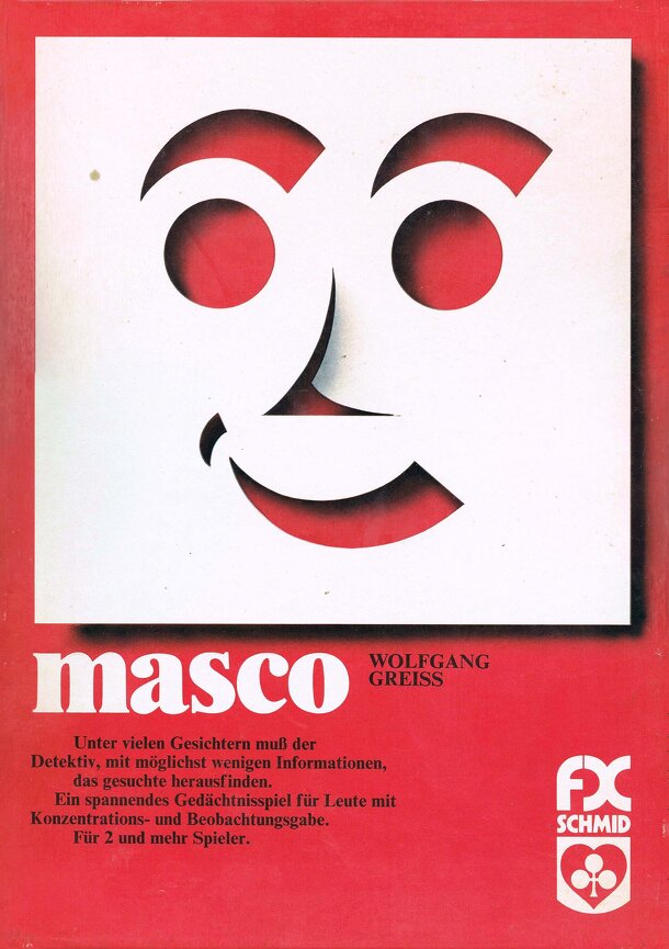 Deduction game. Components: 54 wooden tiles featuring faces with a variety of eyes, noses and smiles, 18 control cards showing 18 face variations, red and white plastic counters. Game for 2 players, one the informant and one the detective. 54 tiles are placed face up in the lid of the box or on the table. The informant selects one card from the 18 control...