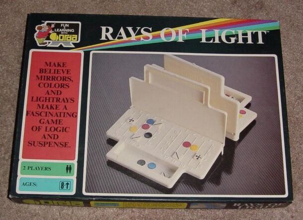 In Rays of Light, each player sets up colored chips and chips representing mirrors on their grid, which is hidden from their opponent, much like in Battleship. The object is to guess what your opponent's grid looks like, by shooting imaginary light rays into the grid. Your opponent will tell you where on the grid the light exited, and what color it was....