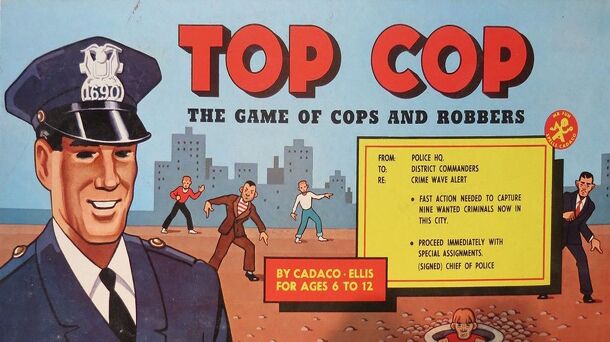 From publisher site: Fast action, as cops patrol the city on a crime wave alert! With cops playing as pieces, players search for clues to capture 9 criminals on the WANTED list. Clues found on patrol are pegged on the Big City game board. 1st to capture 3 robbers is TOP COP. Synopsis: On your turn, if there are not 3 "WANTED Posters" (cards) displayed, you...