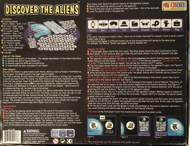 Game play: Each player takes a playing board, feature detector, and marker, then draws a feature card. Only aliens showing this feature live on the player's planet. Each player tries to find out the feature card that the other player drew. On their turn, a player draws a face-down alien card and asks the other player if that alien lives on that player's...