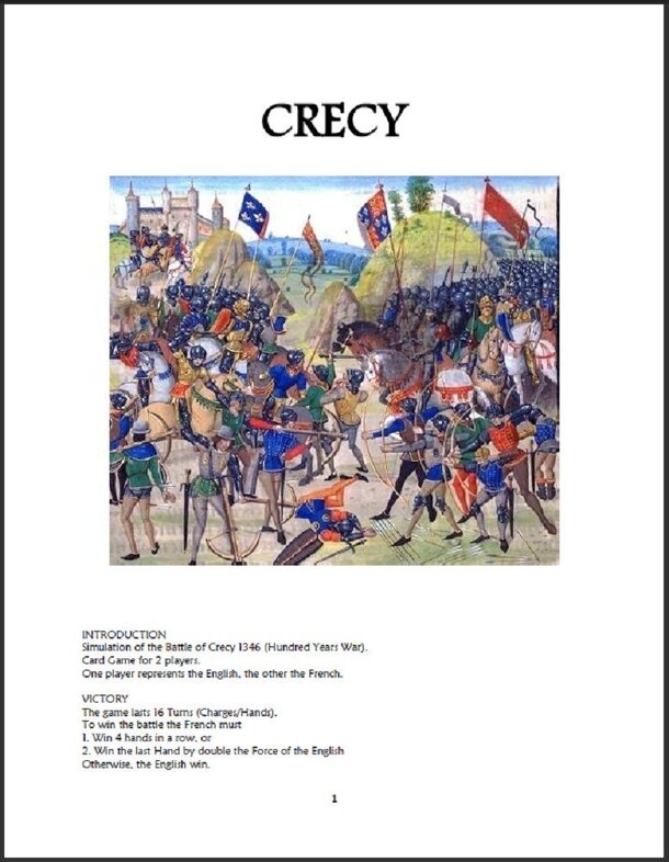 “Simulation of the Battle of Crecy 1346 (Hundred Years War.) Card Game for 2 players. One player represents the English, the other the French. Victory: The game lasts 16 Turns (Charges/Hands.) To win the battle the French must win 4 hands in a row, or win the last Hand by double the Force of the English, otherwise the English win.” Each side has its own...