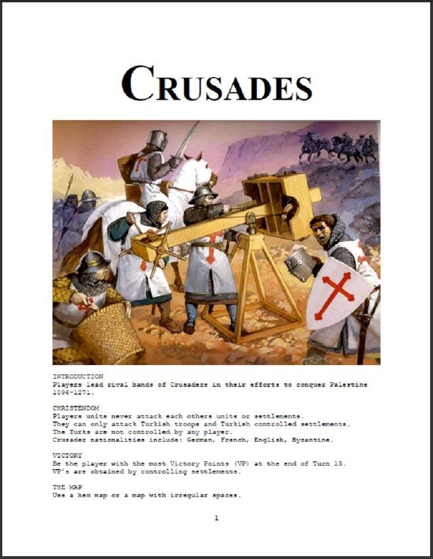 “Players lead rival bands of Crusaders in their efforts to conquer Palestine 1096-1271. Christendom: Players units never attack each others’ units or settlements. They can only attack Turkish troops and Turkish controlled settlements. The Turks are not controlled by any player. Crusader nationalities include: German, French, English, Byzantine. Victory: Be...