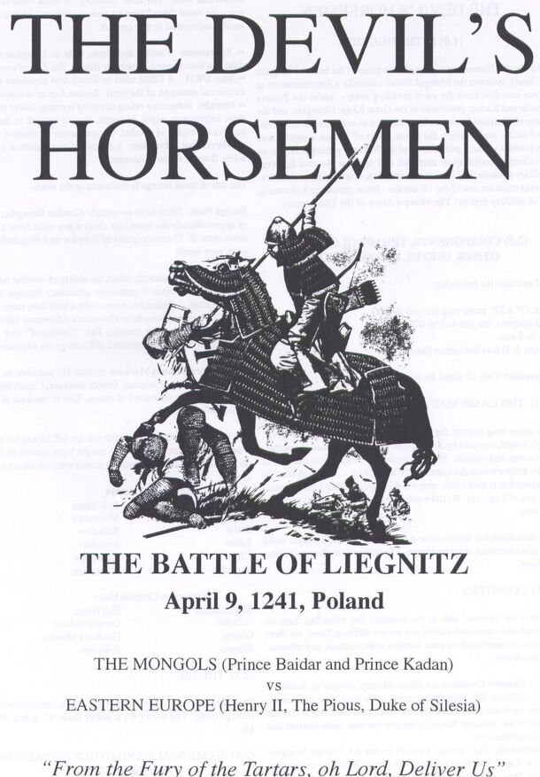 The Devil's Horsemen is a simulation game of the battle of Liegnitz (Poland), between the Mongol Empire and the combined defending forces of European fighters. Desktop published containing an 11" x 17" color map, 285 color paper counters (to cut and paste), played an indeterminate number of turns until one side achieves Victory. NOTE: This game uses the...