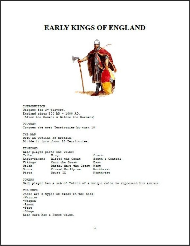Wargame for 2-5 Players. England circa 800-1000 AD. Players can choose to be: Vikings, Anglo-Saxons, Welsh, Scots, or Picts. Area Map. Racial Special Abilities. No Dice. Simple rules for Unit recruitment & Movement. Players share a common deck which is used to resolve Battles. Card types include: Warrior, Weapon, Armor, Fort, & Siege. Conquer the most...