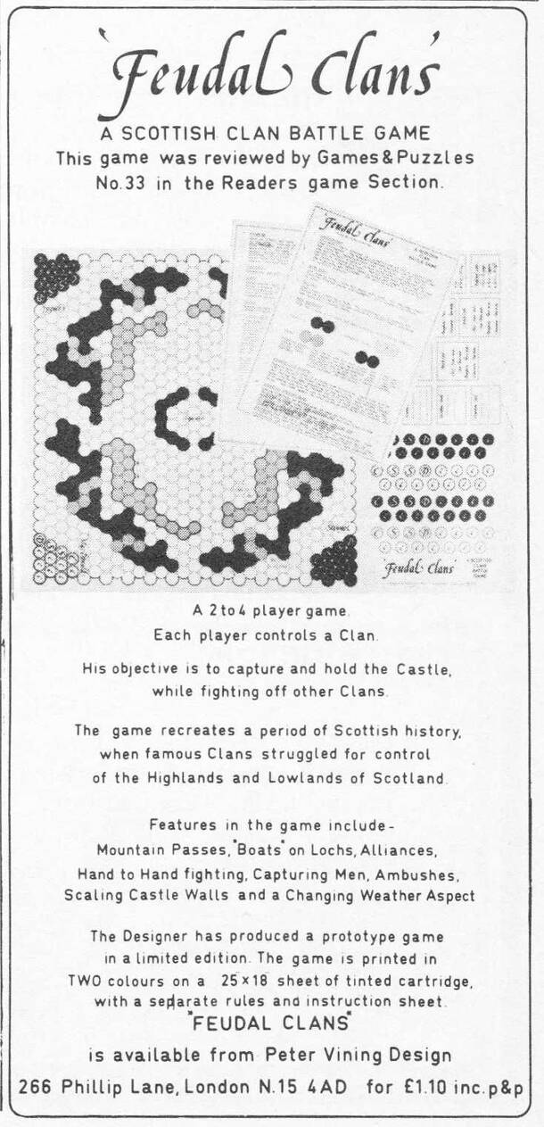 Each player controls a clan in the Highlands or Lowlands of Scotland. The game recreates a period of Scottish history when famous clans struggled for control of Scotland. Features in the game include - mountain passes, boats on lochs, alliances, hand to hand fighting, capturing men, ambushes, scaling castle walls and a changing weather aspect. The designer...