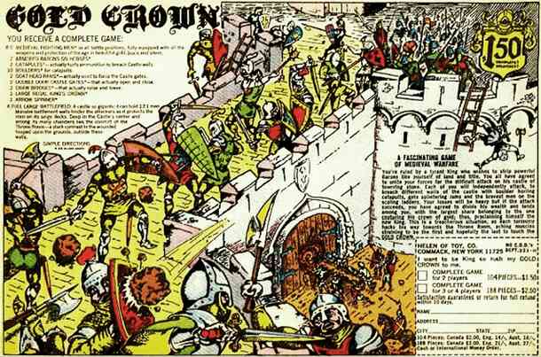 One of the games released by Helen Of Toy Game Company that graced many a comic book from the late 50's into the early 80's. Gold Crown is a classic Comic Book War Game which contained 3D Toy Soldier Knights ("in beautiful Gold, Black & Silver"), along with Horses, Catapults and other Accessories - mostly made by GIANT in Hong Kong with a plastic "wipe and...