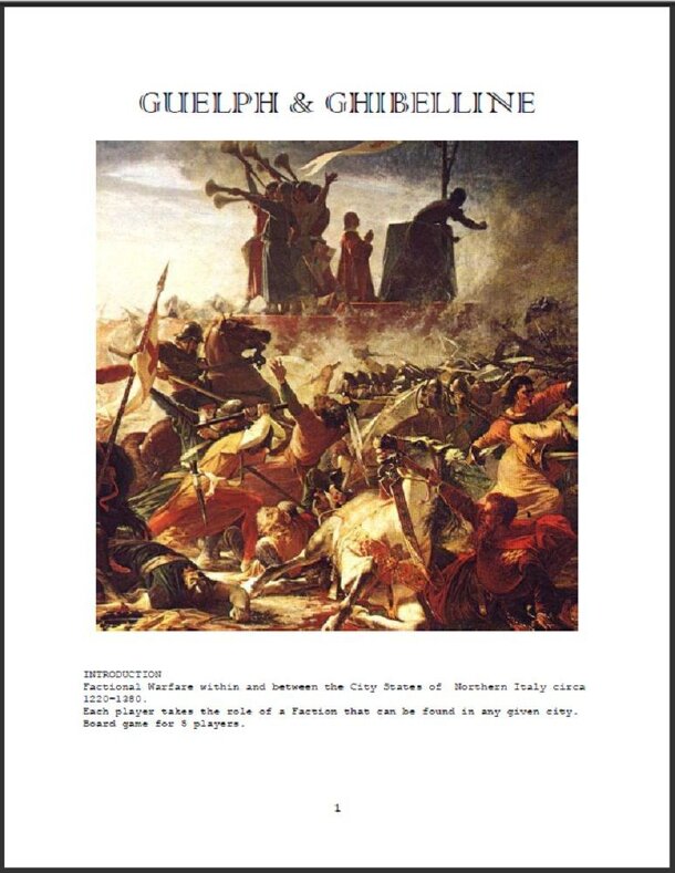 (from Europa Simulazioni website:) Guelphs and Ghibellines simulates the traditional clashes between 13th century armies with an original system which is both simple and accurate, allowing to reproduce typical tactics of the battle of the era, and focusing on progressive combat fatigue and loss of cohesion of formations on the battlefield. Cavalry remains...