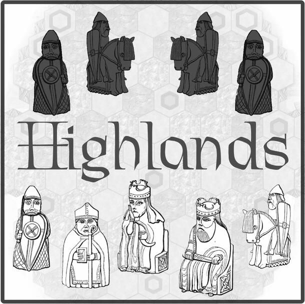 Description from the publisher: Highlands is a solo boardgame set in middle ages Scotland, in a time of rival clans, factions, and kingdoms. Play as a king/earl/jarl striving to gain reputation and power as you build your empire in the highlands. Along the way, you will explore, decide how to expand, and encounter rival armies and a variety of creatures...
