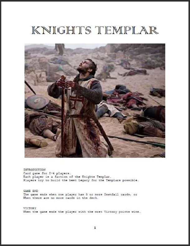 "Card game for 2-4 players. Each player is a faction of the Knights Templar. Players try to build the best Legacy for the Templars possible. The game ends when one player has 5 or more Downfall cards, or when there are no more cards in the deck." The game uses a custom deck composed of nine types of cards: Legacy, Allies, County, Treasures, Mission, Power...
