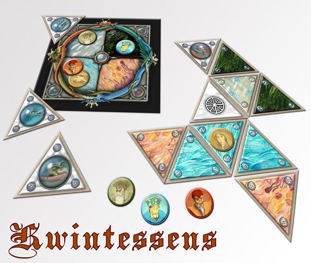 To impress the king, players in Kwintessens try to be the best alchemist. In ancient times, all elements were thought to be built of fire, water, earth and water, which were represented by triangles. In the game, each player tries to outwit the others by building four pure elements, i.e., triangles surrounded by triangles of the same element. To do so, the...