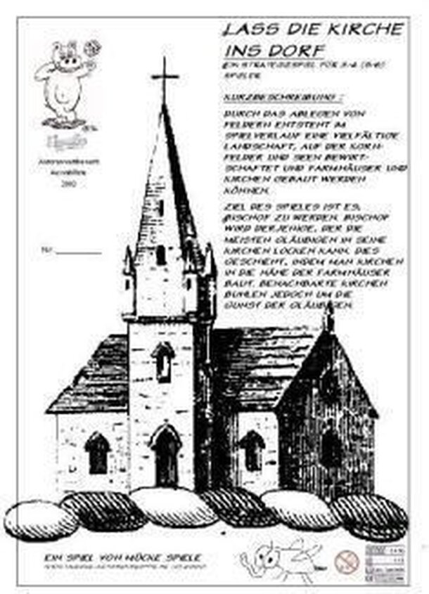 1580. The colonization of the country proceeds rapidly. Also the population increases rapidly. The first settlers are not only followed by dealers and scoundrels but also by the church. Soon a new bishopric will emerge. Laß die Kirche im Dorf is a strategy game for 2-4 players. By placing fields an abundant landscape emerges with fields of wheat and lakes...