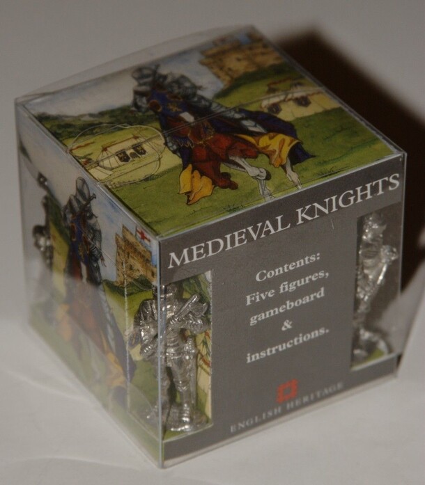 A small gift game sold at English heritage sights which feature castles, abbeys or some medieval history, Game box comes with 5 pewter Knights from different ages in history, games is very basic get from one side of a slim checkered board to the other, one player has 4 figures the other player just 1. from the back of the box: This period in history...