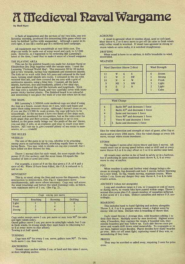 Designed by Rod Hunt, A Medieval Naval Wargame is a miniatures rules set that appeared in Issue #1 of Military Enthusiast magazine. The game is designed for 1/3000th scale models (although other scales may be used). The game uses 6-sided dice and includes simple rules for weather, boarding, archery attacks, the affects of tides and currents, morale, &...
