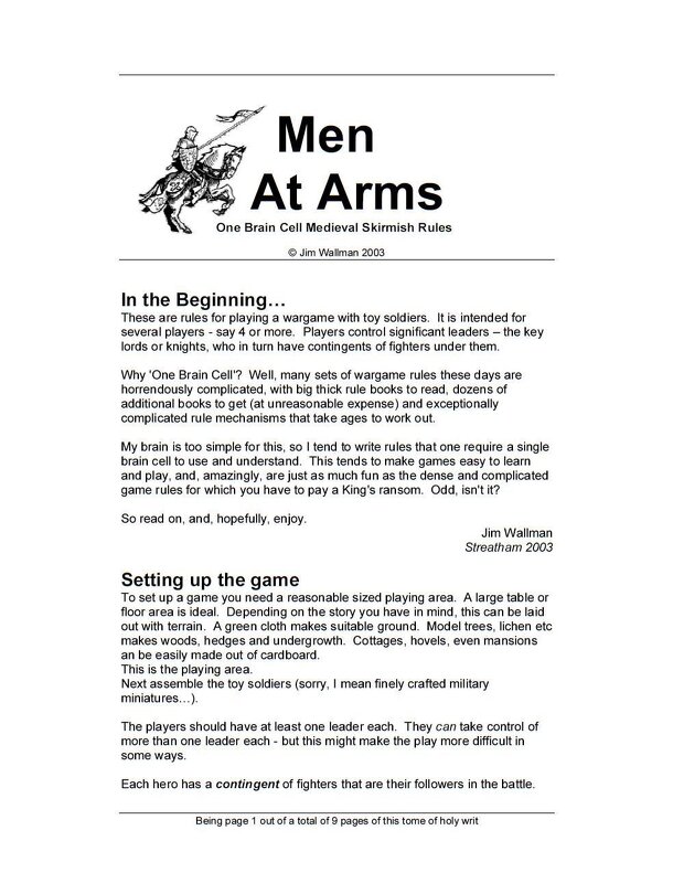 From the rulebook: "These are rules for playing a wargame with toy soldiers. It is intended for several players - say 4 or more. Players control significant leaders - the key lords or knights, who in turn have contingents of fighters under them." Medieval skirmish rules for fighting battles between small armed groups. Each figure represents a single...