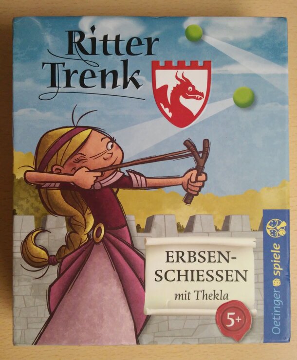 In this game of skill from the Knights Trenk universe, players have to balance two green balls (peas) into the appropriate holes using four different cards of each color (red, blue, yellow, green). If you have met one of the people on the card with the peas (the balls holed), you get the card. Otherwise, the next player's turn. If you have all four cards...