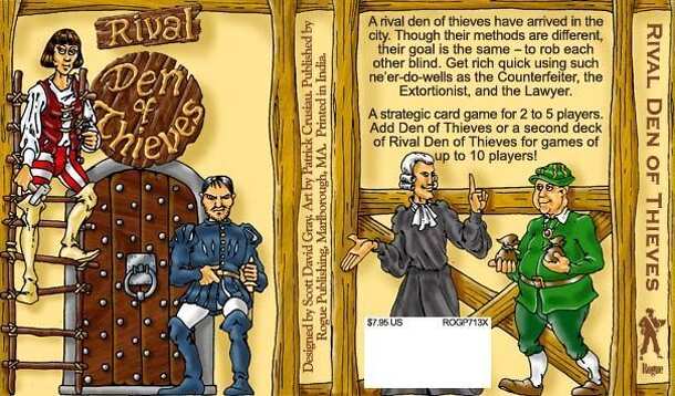 Rival Den of Thieves is a strategic card game for two to five players. The criminal element of the city is in a race to steal the most -- from the bank or each other. Each player controls one of the dens, and each card in her/his hand represents one of the thieves in his/her den. Each player chooses which of her/his thieves to make active, knowing which...