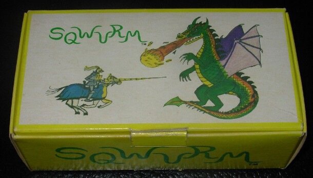 From the box: Sqwurm is a fun, fast-moving, triangular card game! You as a competitor play the part of a Wizard-King. The Wizard part of you tries to conjure up an entire dragon. The dragon breathes fire, captures damsels, and hoards treasure much like dragons in the days of old. The King part of you sends out knights to attack or defend a dragon, rescue...