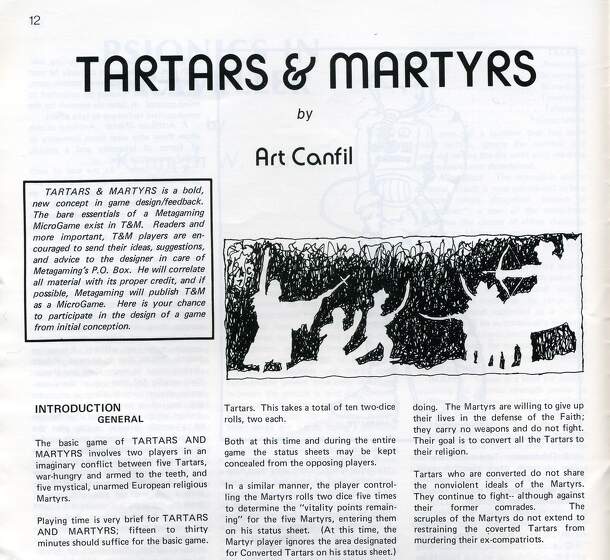 An experimental, skeletal Microgame published in issue 20 of the Space Gamer, this game might have been expanded into a full microgame in the future based on reader input. In it, five European religious martyrs attempt to convert five Tartars before being killed. Martyrs cannot fight, but converted Tartars can. Vitality of units and success of "attacks"...