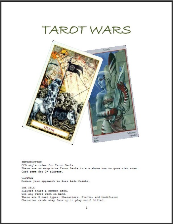 "CCG style rules for Tarot Decks. There are so many nice Tarot Decks it’s a shame not to game with them. Card game for 2+ players." Each card in the Tarot deck is classified as a Character (with a designated Force value), Event, or Modifier Card. Character Cards stay in play until they are killed. Modifier Cards are attached to Characters. Event Cards are...