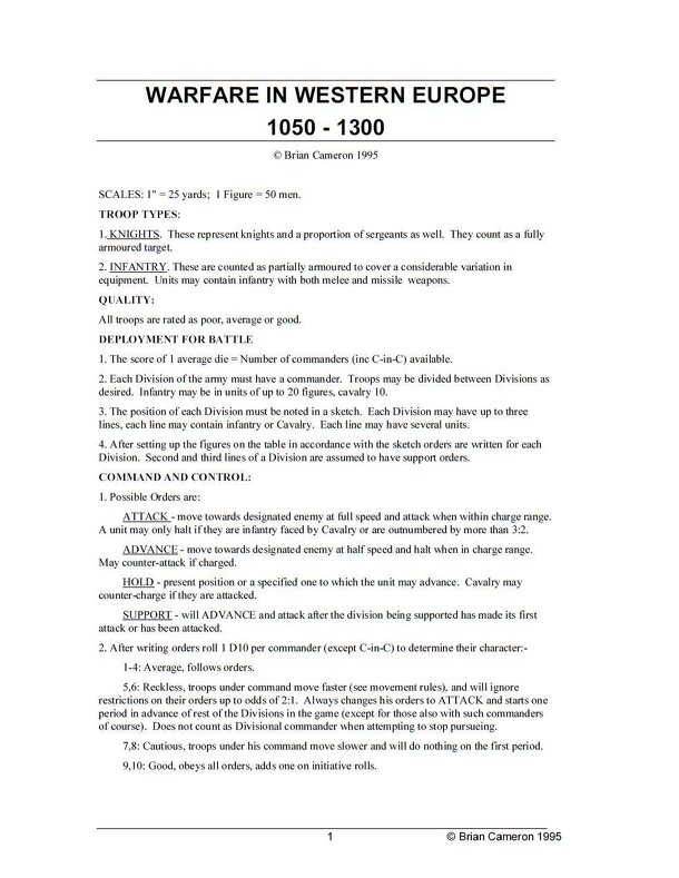 A set of rules for fighting large scale medieval battles. Each figure represents 50 men and each inch represents 25 yards. Troops are divided into two types, mounted knights and infantry. Infantry can include bowmen and crossbowmen. The opposing armies are divided into divisions (consisting of 20 infantry figures or 10 cavalry figures) each of which has a...