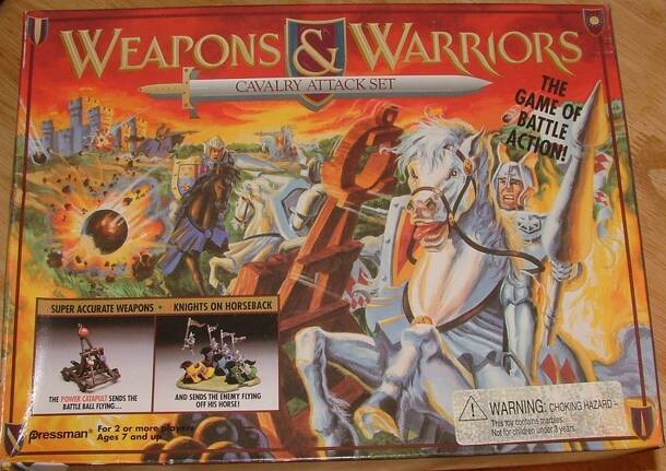Copyright 1995 by Pressman this box contains The Power Catapult, The Defense Shield, 13 Soldiers, 24 Battleballs, and a label sheet. From the back of the box: This Weapons & Warriors Weapon Pack features one of the most popular weapons and one of the sturdiest defenses of the medieval era. The finely detailed Power Catapult hurls Battleballs at the enemy...