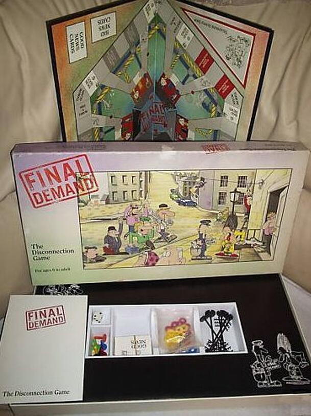 Final Demand - The Disconnection Game From the rulebook: "Players race to connect their houses to the water, electricity and telephone supplies; then they try to remain connected, while disconnecting the other players. The winner is the last player to retain all or some of his supplies. Players who lose all of their supplies are out of the game!" The game...