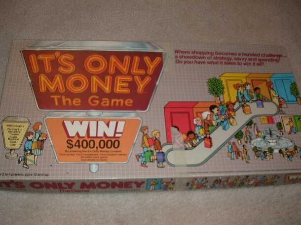 From the box: "Shoppers enter the It's Only Money Mall via the spinner and begin shopping, with the aim of acquiring 5 spaces on the It's Only Money Shopping Money Card, while denying opponents' the ability to do the same. Perilous pitfalls and profitable bonus spaces all contribute to the playing excitement. The first player to acquire the five spaces, as...