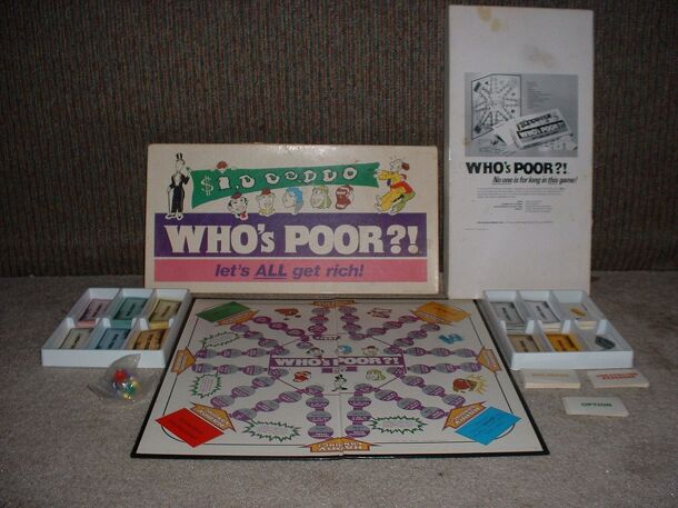 From the back of the box: IF you aren't rich by the fourth week in this game, you're really upon hard times. Be prepared for a lot of razzing by the other players. Once you are rich, see if you can stay that way. The big move could knock you flat. Or, another rich player could challenge you for all of your wealth. You'd better challenge him first!...