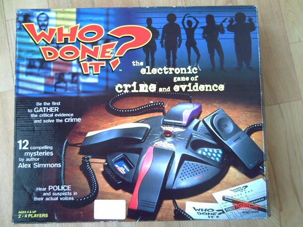 In Who Done It? players assume the roles of detectives and sit around a four-person console with four telephone hand-sets. Players take turns calling in for clues which are delivered via their personal phone, and some clues are delivered via all-points-bulletins over a common speaker. Players record clues on a special playing sheet provided to track...