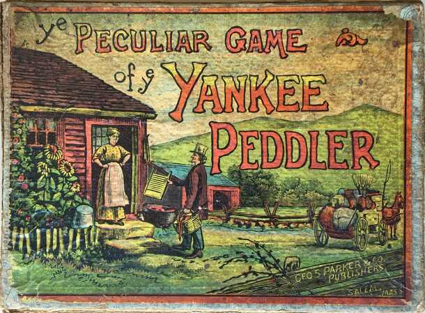 This game consists of a deck of 15 large cards, each bearing the name, picture and price of an item that might be sold by a wandering peddler, and four decks (cream, orange, red and blue) of 15 small cards, each with a typical farm product and value. One player takes the role of the Yankee Peddler, while the others are farmers. On each turn, the peddler...