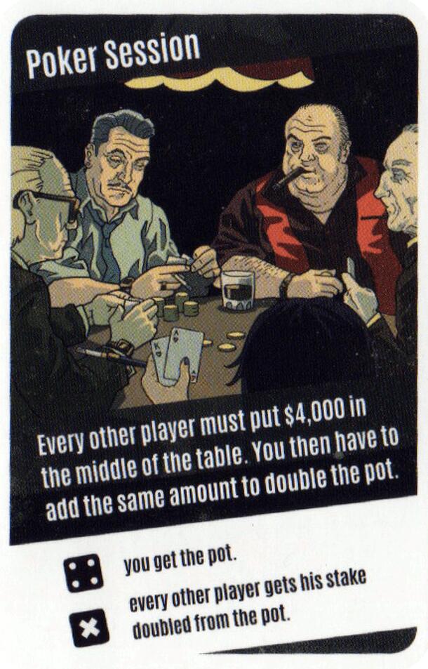 Promo card for La Cosa Nostra named "Pokerrunde" ("Poker session"). The card says: "Jeder deiner Mitspieler legt $ 4.000 in die Mitte. Dann legst du genau so viel Geld dazu, wie schon im Pott liegt. Mit einer 4: du bekommst den Pott. Andernfalls: jeder deiner Mitspieler erhält seinen Einsatz verdoppelt aus dem Pott." (Every other player must put $4,000 in...