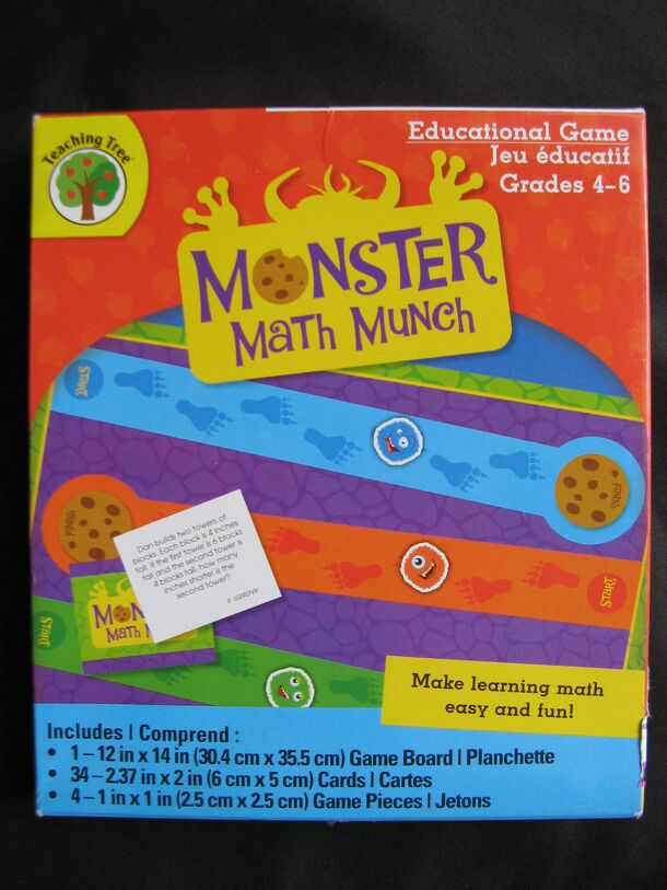 Monster Math Munch is an educational math game for children in grades 4 to 6. Each player places their game piece on the start of their own track. The first player chooses a card an reads the math problem on the card to the player to their left. If that player answers correctly he or she moves one space forward. Play continues to the left until one player...