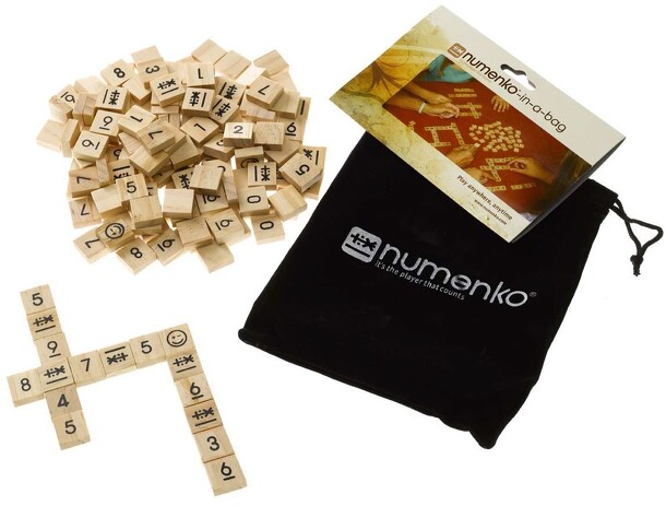 Numenko-in-a-bag features game play and components similar to the Numenko board game - but without a game board and with a few other changes. The wooden tiles feature digits (0-9), a Multichoice symbol (that stands for the player's choice of addition, subtraction, multiplication, division or "is equal to"), and a Freechoice symbol (that can be a digit or...