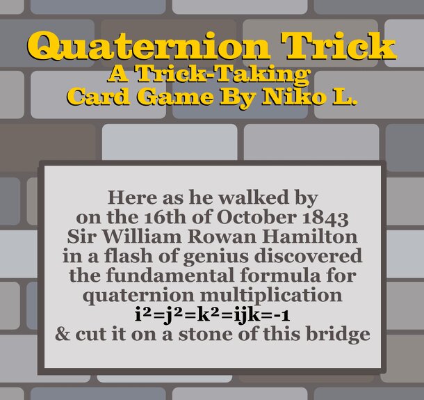 Quaternion Trick is a compendium of four related (but different) trick-taking games. Each game centres around the same trick resolution mechanism inspired by the mathematical concept of the Quaternion. Tricks resolve in the following way: If all cards played share the same suit, the trick resolves as normal. Highest card wins. If two of the cards share the...