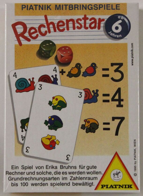 Rechenkönig (a.k.a. King of Numbers) is a collection of number-learning games using a base set of cards that are cleverly designed. One set of cards has a simple equation, like "2 + 1" or "9 -7". Another set has solutions, like "=3". The cards have two special features. First, on one side graphics are shown with the numbers, while on the reverse the...