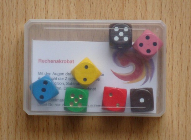 Rechenakrobat (Calculation Acrobat) Rechenakrobat is game consisting out of five dice only. It is a mathematical game in which the player tries to make a correct calculation with the thrown values of the dice. With the eyes of the 5 coloured dice the number thrown with the 2 black dice should be calculated through addition, subtraction, multiplication or...