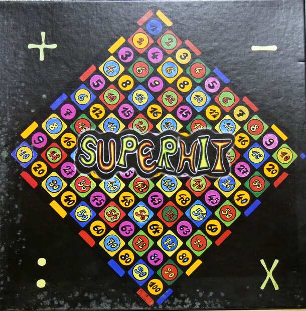 Superhit is a set of many games designed for education in arithmetic. The common components are dice, counters in five colors, and a 10x10 board with numbered spaces; the numbers also have various colors. Some of the later games are suitable for play by adults. In one, players roll four dice and then must use arithmetic operations to produce a number on...