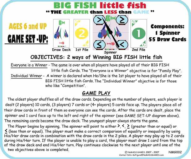 BIG FISH little fish is a comparing whole numbers game for Kindergarten through 2nd Grade. BIG FISH little fish is designed to reinforce basic critical thinking skills by comparing whole numbers and co-operation skills by having Players make correct comparisons. BIG FISH little fish: 44 Number cards 1 Spinner 2 ways to win: "Everyone is a Winner” - The...