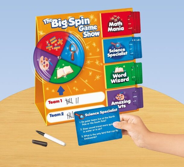 From the Box: "A real live game show you can host right in your own home! The Big Spin game lets contestants answer intriguing questions in 4 key categories: math, science, language and the arts. Kids just spin the wheel to select a category and earn points for each correct answer. The 14 1/2" write & wipe game board lets you tally up points as you play...