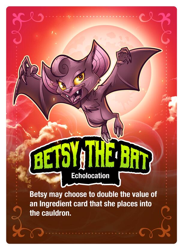 Betsy the Bat is a promotional Character card for Witchful Thinking. Betsy's first Character Ability, Echolocation, represents Betsy's unique senses to find the best ingredients. This Character Ability allows Betsy to double the value of an Ingredient card that she places into the cauldron. So, if an ingredient has a value of +4, Betsy can keep the value...