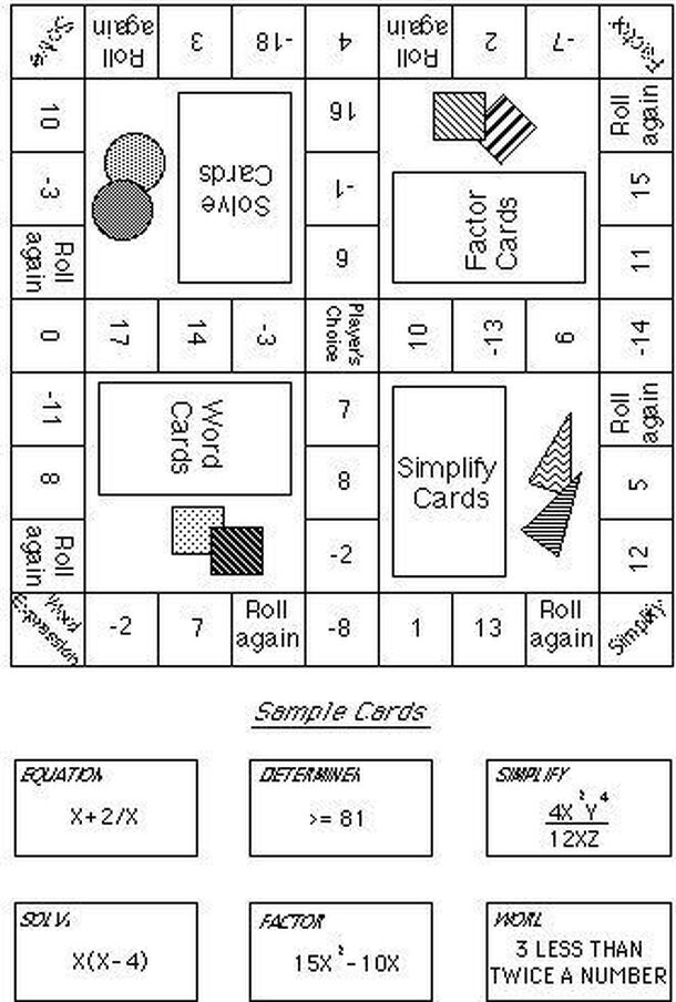 Students will be able to solve, simplify, factor, and write equations according to the standards of an Algebra I course. Players draw a cards from the appropriate piles and answer the questions. Have the other players check the answer on the answer page. If the player gets the correct answer, they place their color chip on that category square. The player...