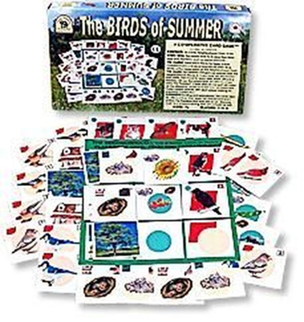 Players are parent birds trying to save their baby birds from predators such as hawks and cats. The cards provide 6 places for nests, 6 birds, 6 predators and 6 kinds of food. All the action takes place on the Neighborhood Chart. Predator dangers are placed near the neighborhood. Places to make nests are played first, then nests, then food for each nest...