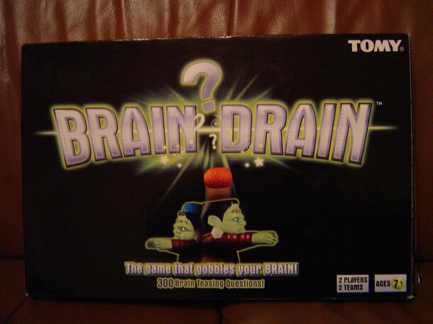 The game that gobble your Brain. 300 Brain Teasing Questions Solve a riddle on a card. For example "Three scary dogs, one girl running. How many legs?" As soon as a question is answered correctly the player flicks a lever and starts asking the other player/team questions. All the time a Frankenstein monster moves down the players track - the lever switches...
